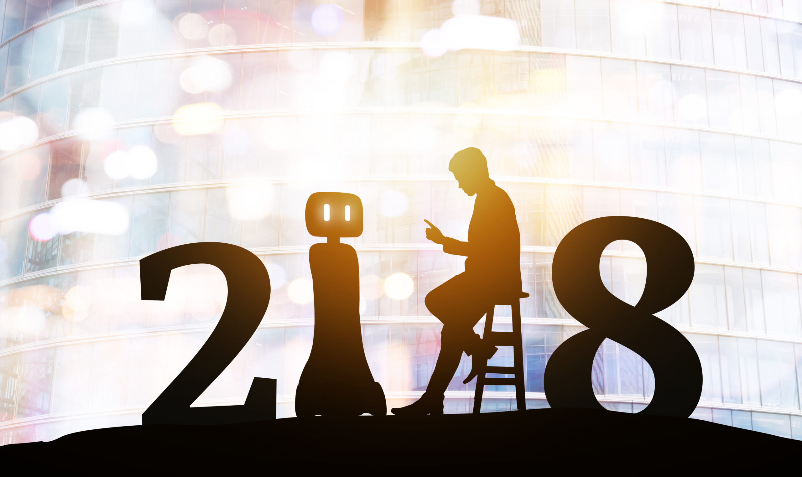 Silhouette of business man talking to automation robot advisor for 2018 new year technology , industry 4.0 , artificial intelligence trend concept. Bokeh flare light effect.